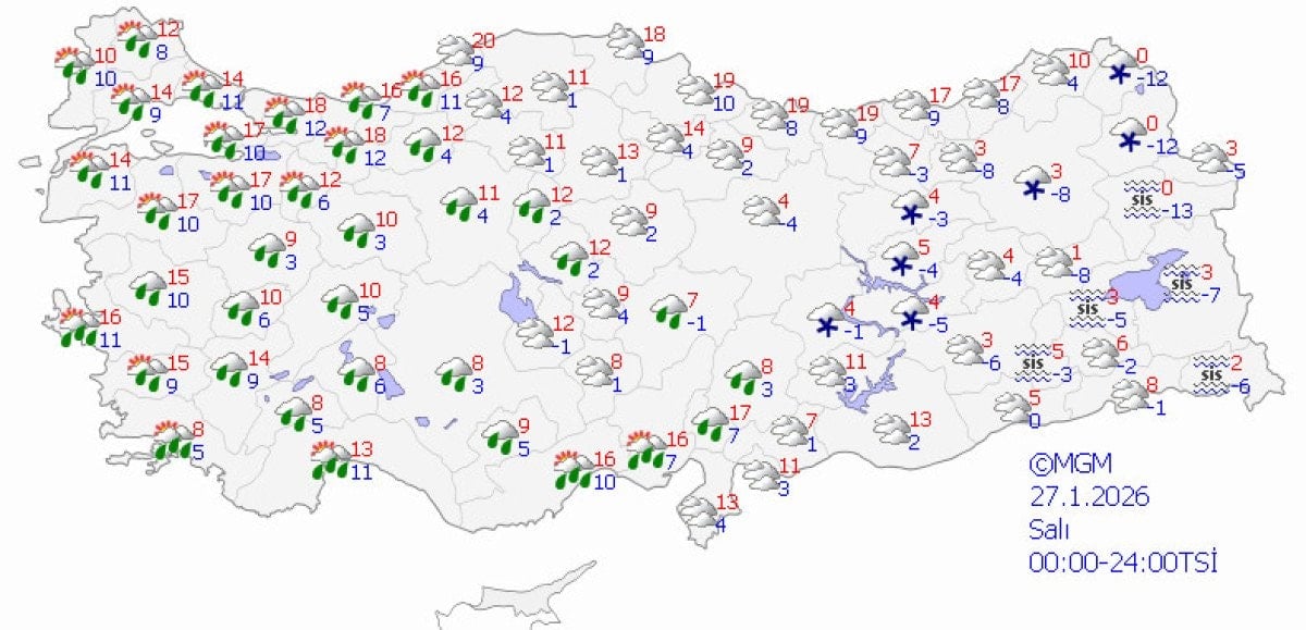 Batı ve güneyde 8-17 derece aralığında yağmurlu havanın hakim olacağı; genel olarak doğu bölgelerde kar, batıda yağmur şeklinde yağış öngörülüyor.