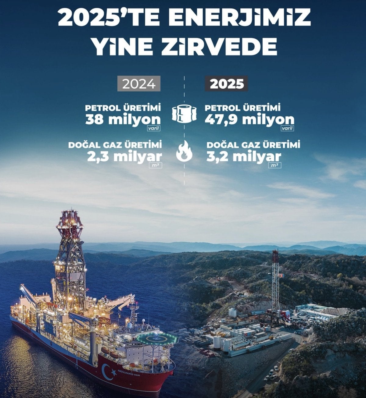 Bayraktar’ın paylaştığı infografikte yer alan verilere göre, 2024 yılında 38 milyon varil olan yıllık petrol üretimi, 2025 yılında 47,9 milyon varile yükseldi.