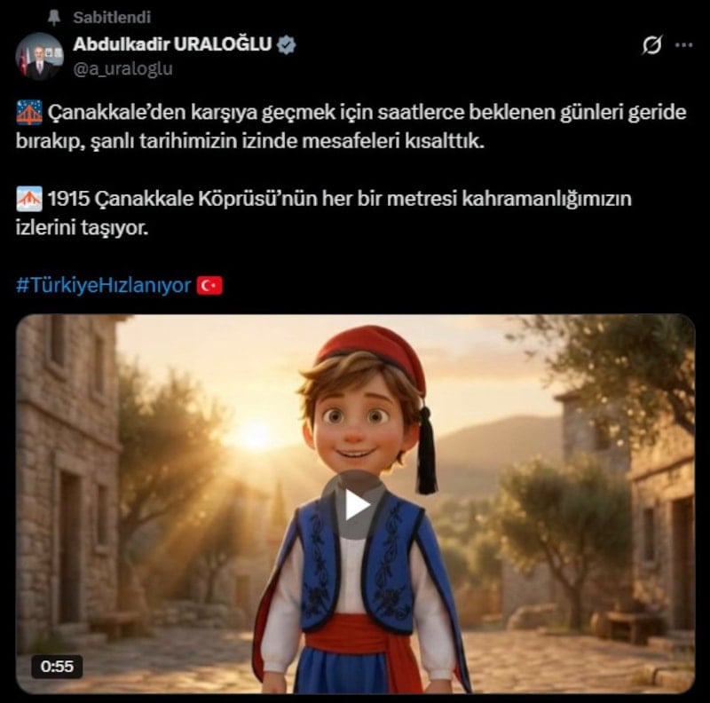 Ulaştırma ve Altyapı Bakanı Abdulkadir Uraloğlu, 1915 Çanakkale Köprüsü’ne ilişkin paylaşım yaptı.