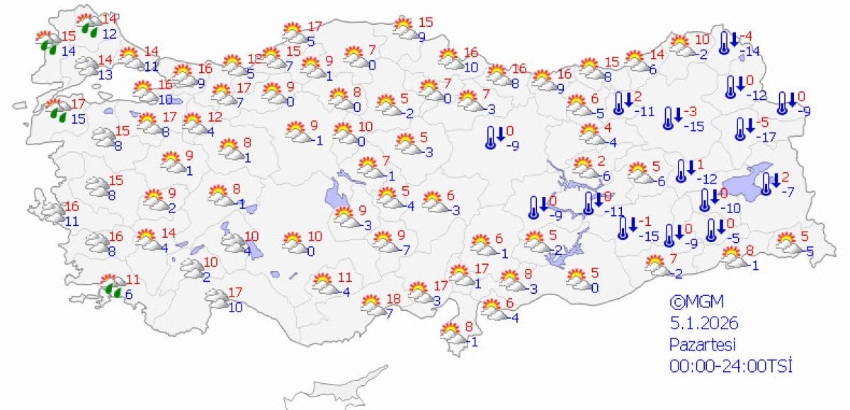 Marmara ve Ege’de sıcaklıklar 15-18 dereceye çıkarken, iç Anadolu’da 5-10 derece civarında, doğuda ise sıfırın altında seyredecek.
