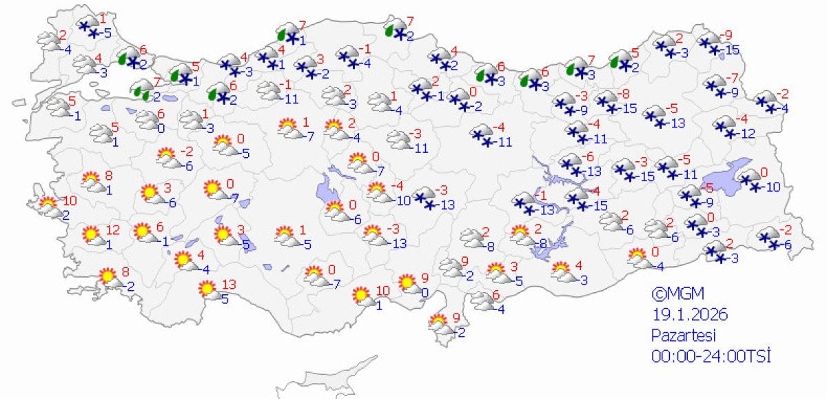 İç ve doğu kesimlerde -5 derece ile -13 derece arası sıcaklıkların hakim olacağı öngörülüyor.
