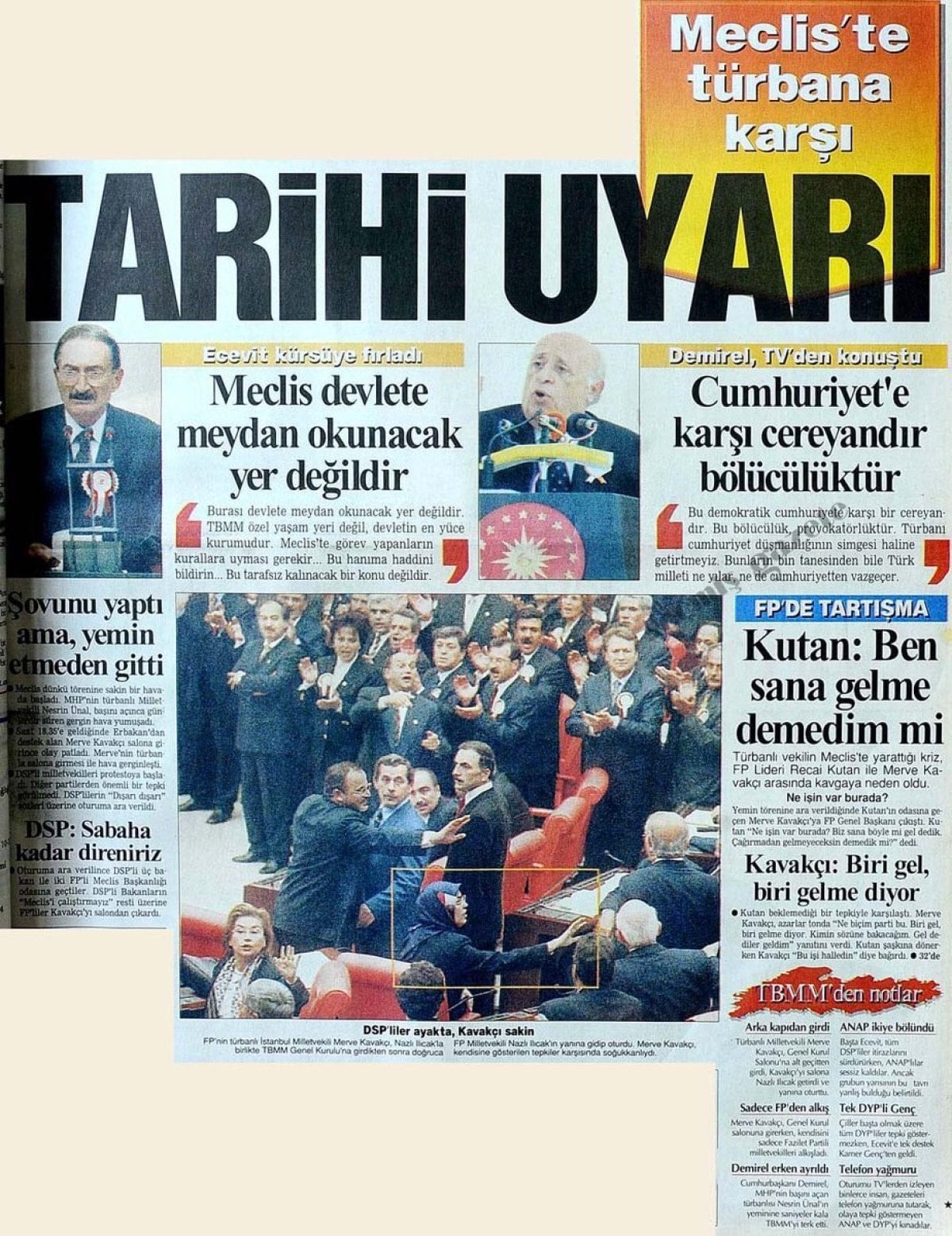 Zorbaca yöntemlerle Başbakanlıktan indirilen, genel başkanı olduğu Refah Partisi hukuksuzca kapatılan merhum Necmettin Erbakan’ın kurdurduğu, merhum Recai Kutan’ın genel başkanı olduğu Fazilet Partisi listelerinden milletvekili seçilen Merve Kavakçı’nın başörtülü bir hanım olması ise dönemin laikçi odaklarının büyük tepkisini çekmişti. Başta Bülent Ecevit’in DSP’si olmak üzere; siyasi çevreler, askeriye ve yargı çevreleri, kartel medyası, STK’lar, kanaat önderleri ile muhtelif ünlüler ortamı germek için ellerinden geleni yapmaktaydılar.