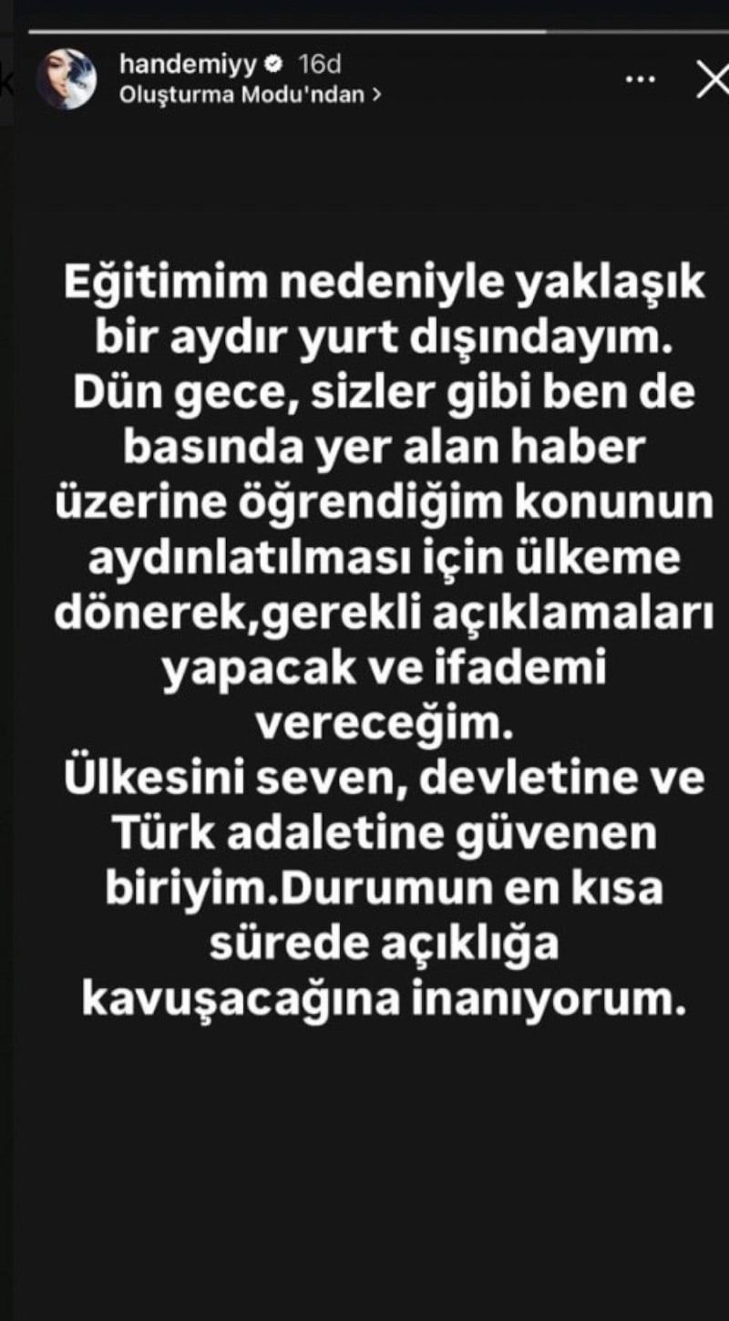 Uyuşturucudan yakalama kararı bulunan Hande Erçel’den açıklama geldi