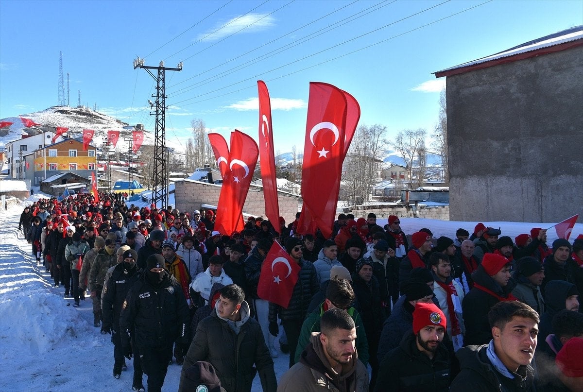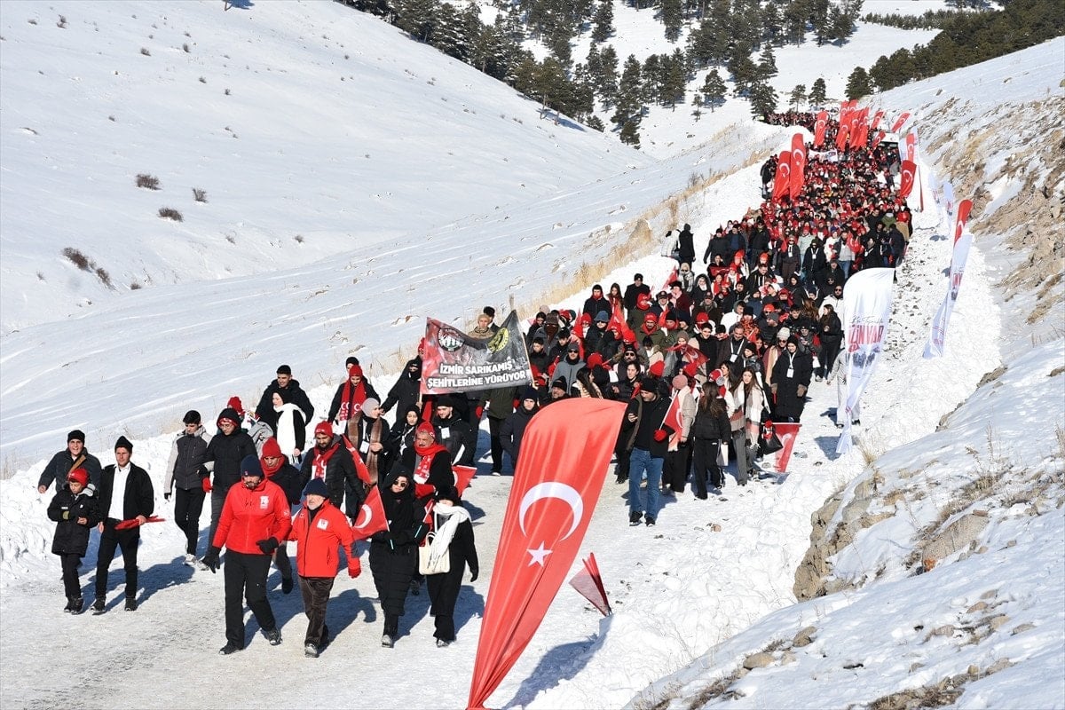 Kars’ın Sarıkamış ilçesinde binlerce kişi sabahın erken saatlerinde ellerinde Türk bayraklarıyla eksi 15 derece soğukta Sarıkamış şehitleri için yürüdü.