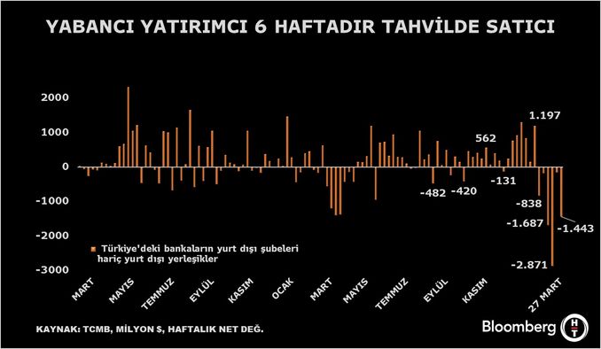 Türkiye Cumhuriyet Merkez Bankası (TCMB) verilerine göre, 27 Mart haftasında Türk tahvillerinde 1,3 milyar dolarlık net satış kaydedildi.
