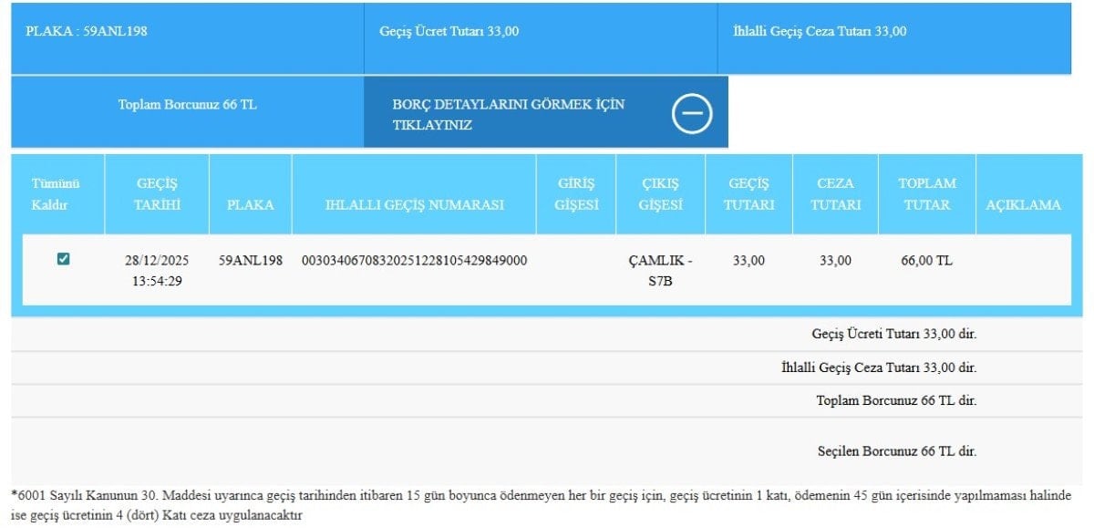 Ceza ihbarnamesinde, 28 Aralık 2025 tarihinde saat 13.54’te 59 ANL 198 plakalı araçla Yavuz Sultan Selim Köprüsü ve Kuzey Çevre Otoyolu Çamlık-S7B gişesinden ihlalli geçiş yapıldığı bilgisine yer verildi. Bildirimde, cezanın 45 gün içinde ödenmemesi halinde tutarın 4 katına çıkacağı ve hukuki sürecin başlatılabileceği uyarısı yapıldı.