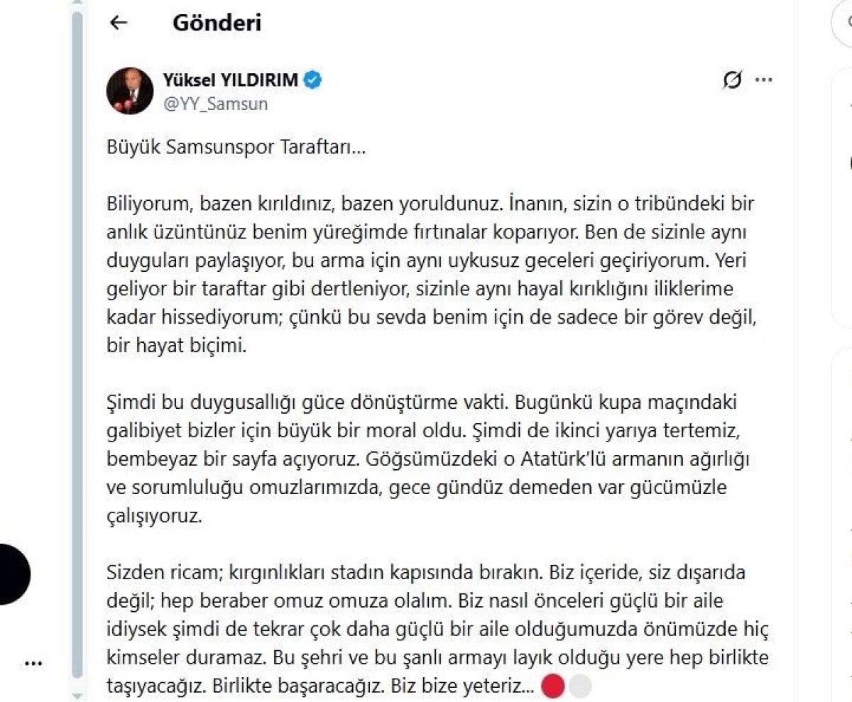 Maça gelen taraftar sayısındaki büyük düşüşün ardından taraftara seslenen Başkan Yıldırım, “Büyük Samsunspor taraftarı; biliyorum bazen kırıldınız, bazen yoruldunuz. İnanın, sizin o tribündeki bir anlık üzüntünüz benim yüreğimde fırtınalar koparıyor. Ben de sizinle aynı duyguları paylaşıyor, bu arma için aynı uykusuz geceleri geçiriyorum. Yeri geliyor bir taraftar gibi dertleniyor, sizinle aynı hayal kırıklığını iliklerime kadar hissediyorum; çünkü bu sevda benim için de sadece bir görev değil, bir hayat biçimi. Şimdi bu duygusallığı güce dönüştürme vakti. Dünkü kupa maçındaki galibiyet bizler için büyük bir moral oldu. Şimdi de ikinci yarıya tertemiz, bembeyaz bir sayfa açıyoruz” dedi.