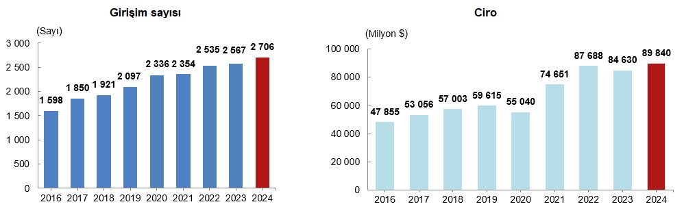 Yurt dışında kontrol edilen girişim istatistiklerine göre, Türkiye kontrolündeki yerleşik girişimlerin yurt dışında kontrol ettiği girişim sayısı 2023 yılında 2 567 ve 2024 yılında 2 706 oldu. Bu girişimler 2023 yılında 84 milyar 630 milyon dolar, 2024 yılında ise 89 milyar 840 milyon dolar ciro elde etti.