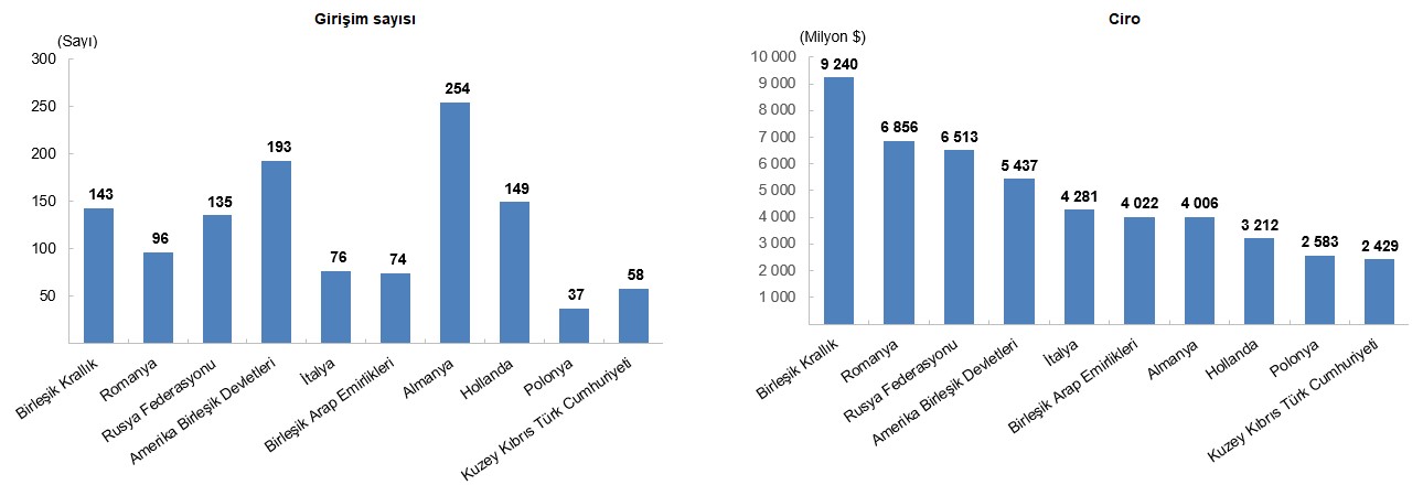 Avrupa (AB27+EFTA) ülkeleri 2024 yılında girişim sayısında %39,2; ciroda %37,1 pay ile birinci sırada yer aldı. Diğer Avrupa ülkeleri ise %19,3 pay ile girişim sayısında, %23,9 pay ile ciroda ikinci sırada yer aldı. Diğer Asya ülkeleri sırasıyla %13,3 ve %13,2 pay ile girişim sayısında ve ciroda üçüncü sırada yer aldı.