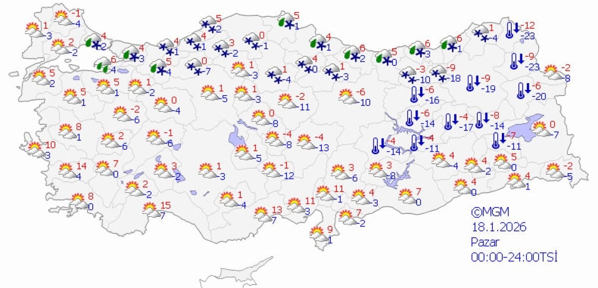 Buna göre; yurt genelinde parçalı ve çok bulutlu, Marmara’nın doğusu, Batı Karadeniz, Doğu Karadeniz kıyıları, Doğu Anadolu’nun güneydoğusu ile Ankara, Eskişehir, Batman, Siirt çevrelerinin yağışlı; kıyıların karla karışık yağmurlu, iç kesimlerin kar yağışlı geçeceği tahmin ediliyor.