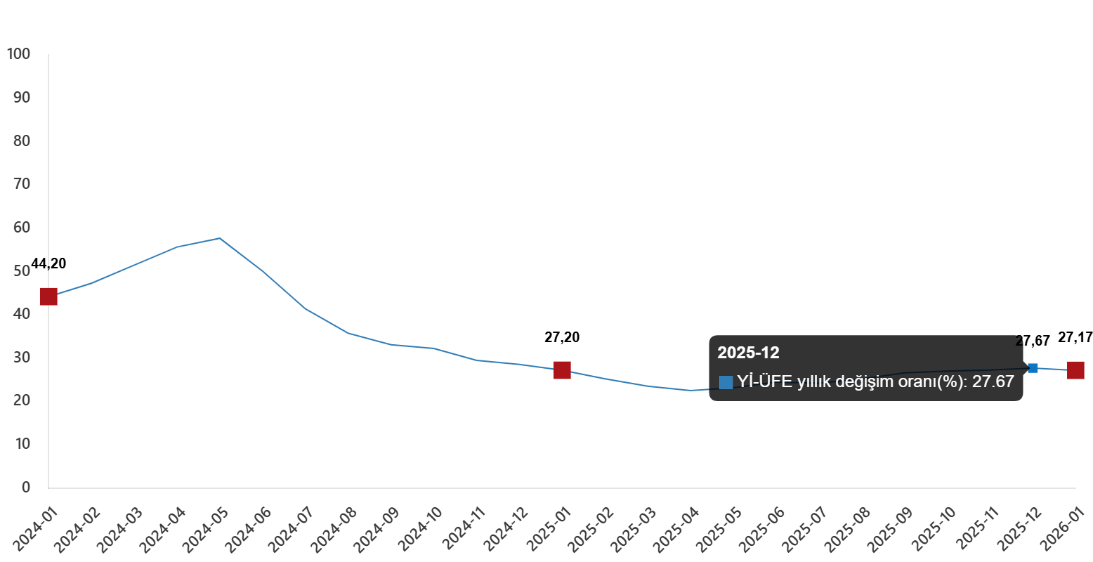 Yİ-ÜFE (2003=100) 2026 yılı Ocak ayında bir önceki aya göre %2,67 artış, bir önceki yılın Aralık ayına göre %2,67 artış, bir önceki yılın aynı ayına göre %27,17 artış ve on iki aylık ortalamalara göre %25,39 artış gösterdi.