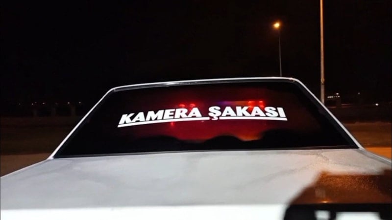 Şüpheli sürücünün aracının arka kısmında yer alan ‘kamera şakası’ yazısı görenlerin dikkatini çekti.